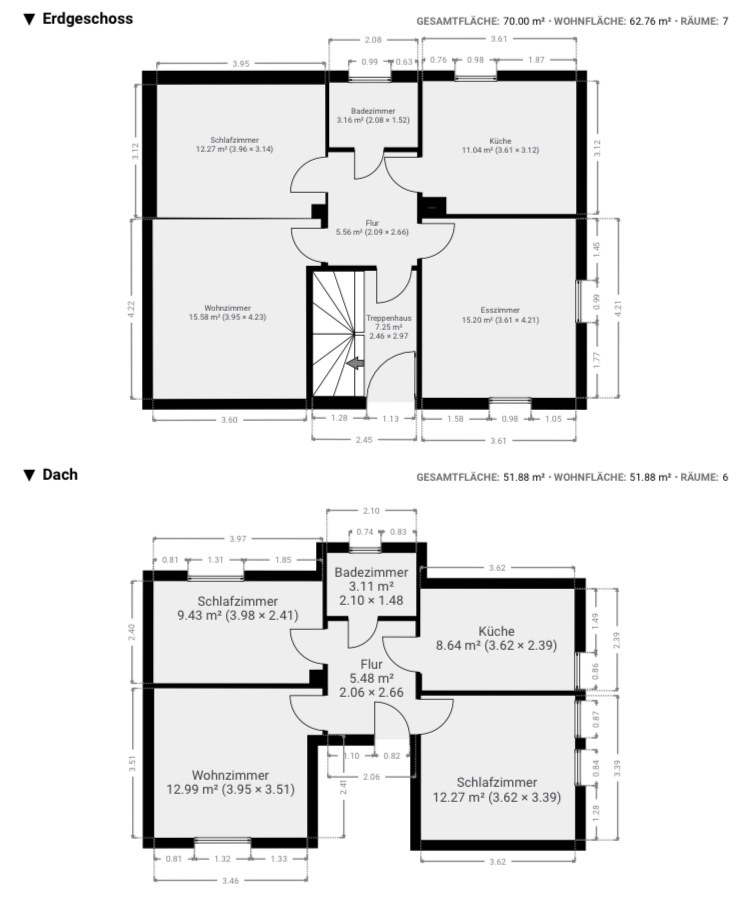 Die Dachgeschosswohnung wurde vor einigen Jahren renoviert. Beide Einheiten verfügen über jeweils drei Zimmer, Küche und Bad.