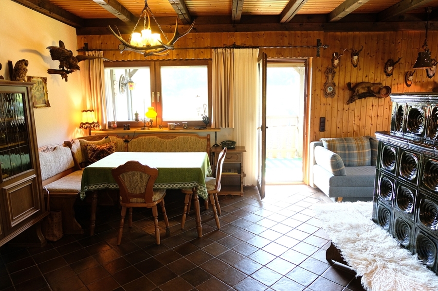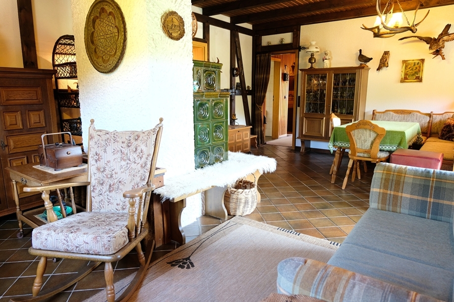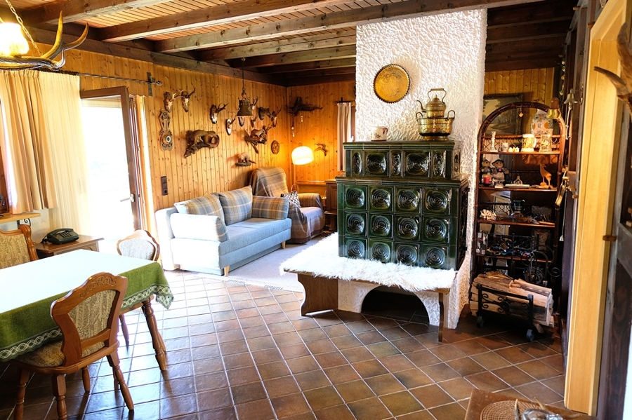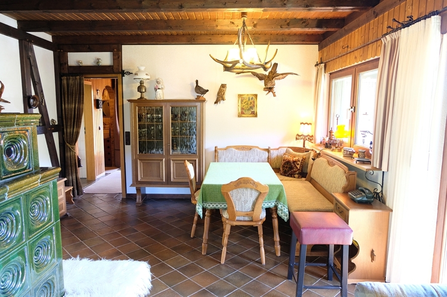 Im Erdgeschoss öffnet sich ein einladender Wohn- und Essbereich, dessen Kachelofen für besondere Gemütlichkeit sorgt.
